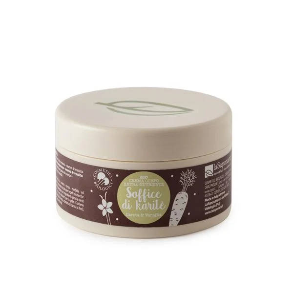 La Crema Corpo Nutriente – Soffice di Karitè è una preziosa crema nutriente dalle molteplici proprietà. E’ realizzata dagli esperti di La Saponaria con ingredienti golosi come cacao e vaniglia e lascia la pelle morbidissima, nutrita e profumata. E’ particolarmente ricca di oligosaccaridi della frutta e preziose vitamine grazie all’estratto di carota a Km0, vaniglia, cacao e karitè. Inoltre la profumazione deriva da una miscela di oli essenziali e/o sostanze di origine naturale, escludendo totalmente qualsiasi componente sintetica. Utilizzabile senza particolari indicazioni sia da un pubblico femminile che maschile.